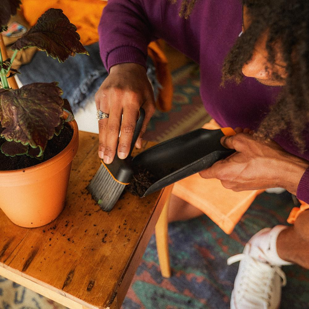 • Schmutz und Erde mit der Bürste ganz einfach auf die Schaufel kehren