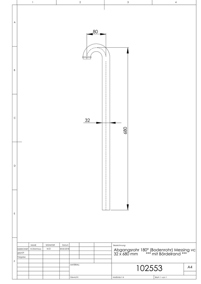 ASW Abgangsrohr 32 x 680 mm, mit Bördelrand, Messing verchromt, 180Grad, Messing verchromt K10804711