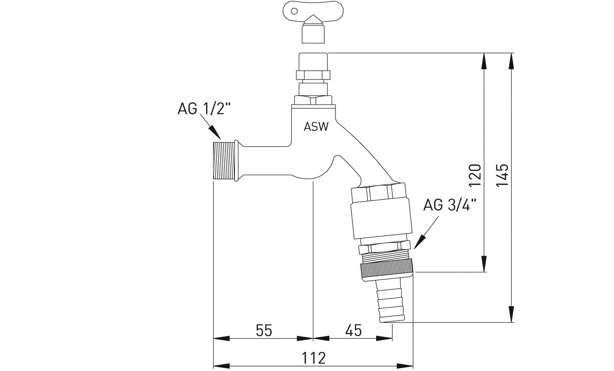 ASW Auslaufventil 1/2", Messing glanz verchromt, Steckschlüssel, Schlauchverschraubung, Rohrbelüfter