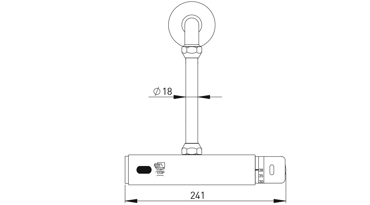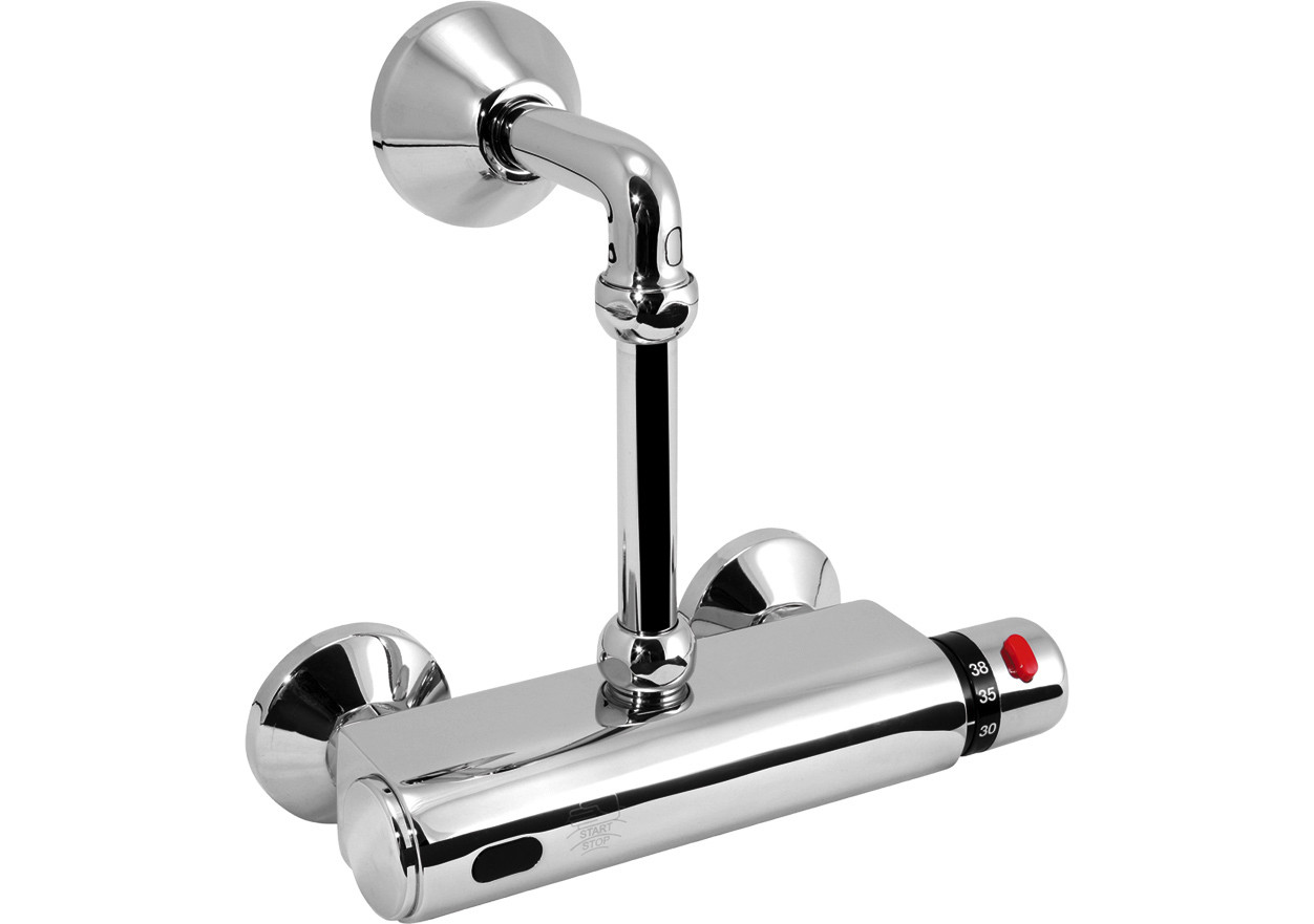 opto-elektronisch berührungslos gesteuert mit START-STOPP Funktion, Temperaturwahl über Thermostatbatterie max. 70 °C mit Verbrühschutz, Parameter einstellbar über Fernbedienung (Hygienespülung und Dauer des Wasserflusses), Wasserfluss werkseitig auf ca. 20 s voreingestellt, komplett mit elektromagnetischem Ventil / Filter / Exzentern und Abdeckrosetten, Schlauchanschluss 1/2", Stichmaß 150 mm