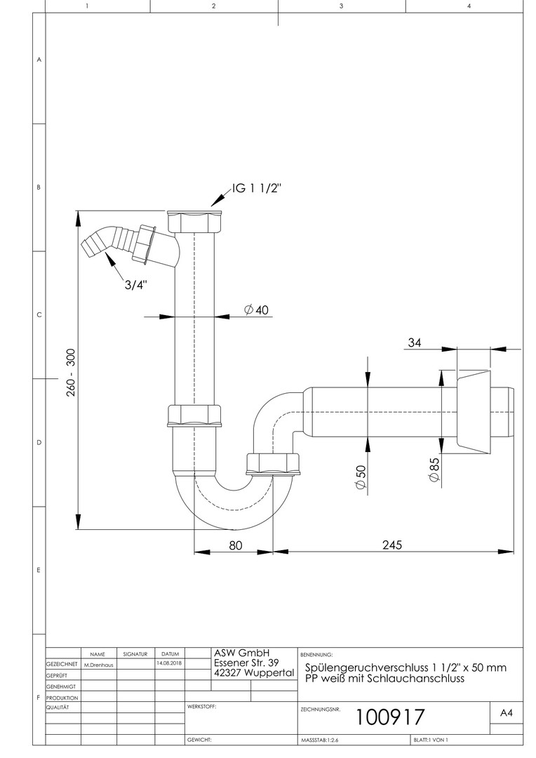 ASW Spülengeruchsverschluss 1 1/2" x 50 mm, PP weiß, mit Schlauchanschluss einfach K10804991