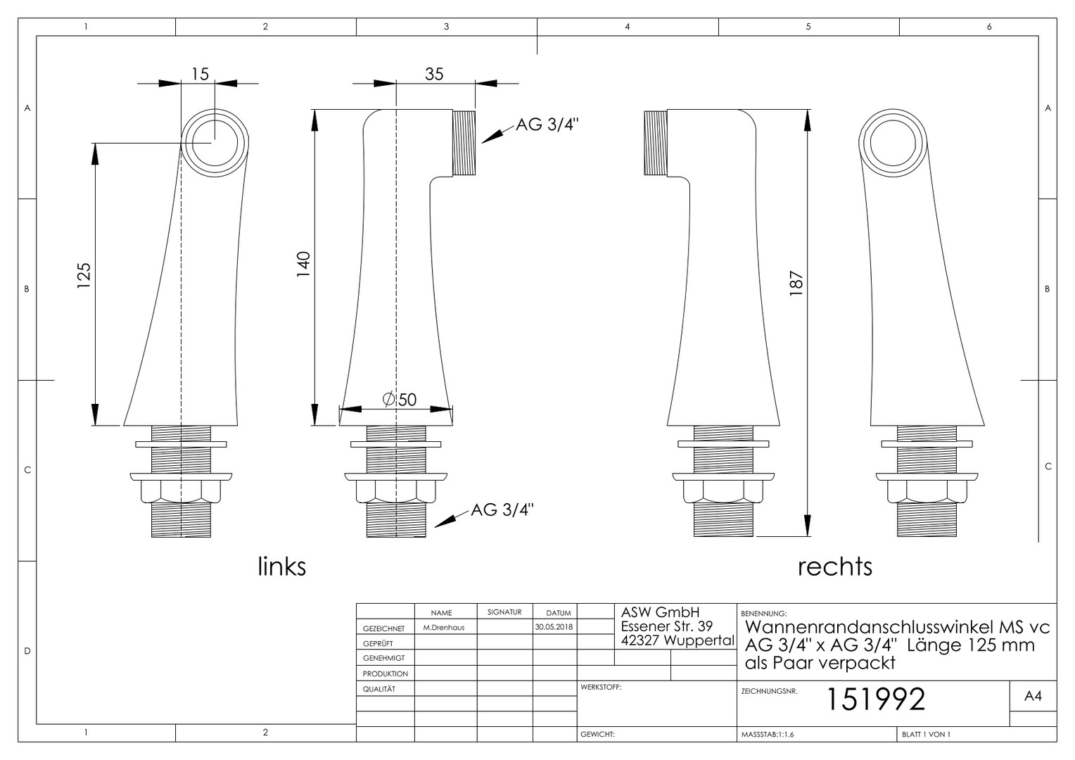 ASW Wannenrand-Anschlusswinkel AG 3/4" auf AG 3/4", 125 mm, Messing verchromt K10803979