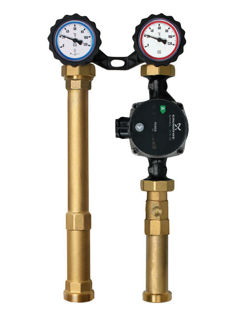 zur Verwendung in ungemischten Heizkreisen, speziell auch zur Speicherladung, bildet Verbindung zwischen Heizkessel und Rohrleitungssystem, komplett, fest vormontiert und auf Dichtheit geprüft mit allen erforderlichen Funktionsbauteilen, formschlüssige Isolation und Wandbefestigung, Pumpenstrang (Vorlauf/warm) besteht aus: Umwälzpumpe, Kombihahn mit Thermometer im Handrad, rote Kennung, Anzeigebereich 0/120 °C, Systemanschluss G1 1/2 außen (Kessel), G1 innen (Heizkreis), Kugelhahn, Längenausgleichsrohr mit Anschlussverschraubung, Rücklaufstrang besteht aus: Kombihahn mit Schwerkraftbremse, Thermometer im Handgriff (blaue Kennung, Anzeigebereich 0/120 °C), Längenausgleichsrohr (Pumpe/Mischer), mit Anschlussverschraubung, Systemanschluss G1 1/2 außen (Kessel), G1 innen (Heizkreis), Isolation dient gleichzeitig als Transportverpackung. Mischer und Stellmotor können nachgerüstet werden