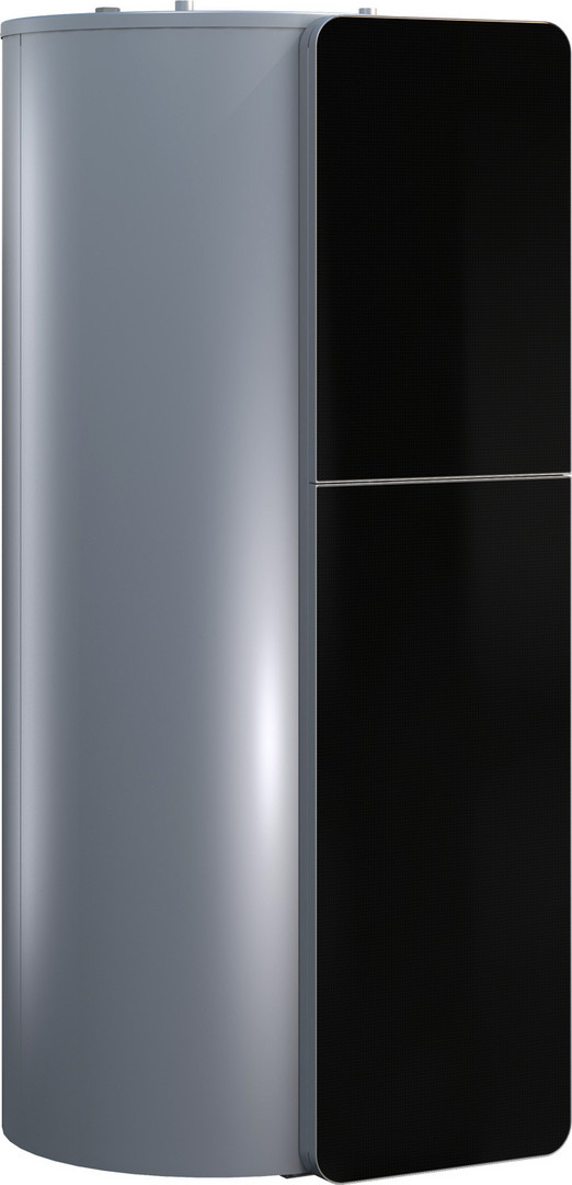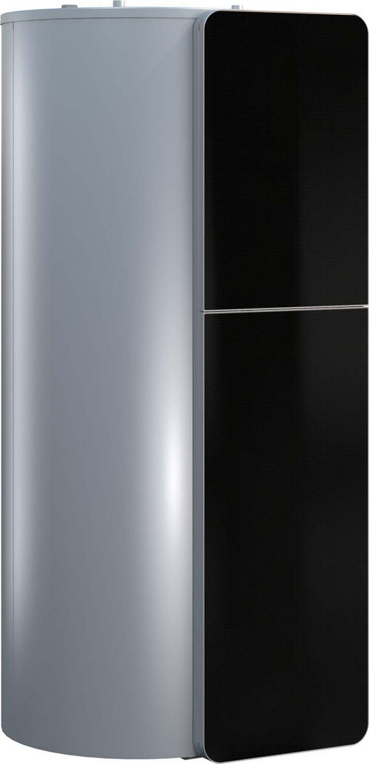 Solarpufferspeicher zur Kombination mit Condens 9000i WM, Pufferspeicher mit druckfestem Stahlbehälter und einer Heizschlange, silberfarbene Stahlmantelverkleidung, Speicherfühler im Lieferumfang, Anschlussgruppe HU oder SHU, zusätzliche Anschlussmöglichkeit für Kaminofen, Designblenden schwarz/weiß, in angepassten Höhen für Condens 9000i WM