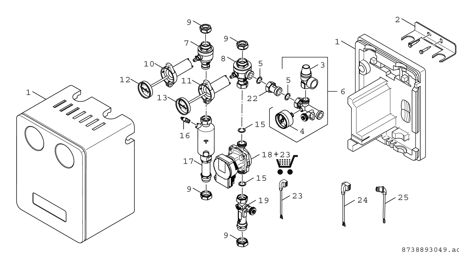 EPP-Gehäuse, hocheffiziente Solarkreispumpe bis 8 m Förderhöhe, Absperrhähne mit Thermometer und aufstellbaren Schwerkraftbremsen in Vor- und Rücklauf, Sicherheitsventil 6 bar mit Manometer und Abschluss für Ausdehnungsgefäß, Spül- und Befüllarmaturen, integrierter Luftabscheider, Volumenstromanzeige 10-42 l/min, Klemmringverschraubung für 28 mm Rohr, >2 Kollektorreihen sind je Reihe zusätzlichen Entlüfter vorsehen