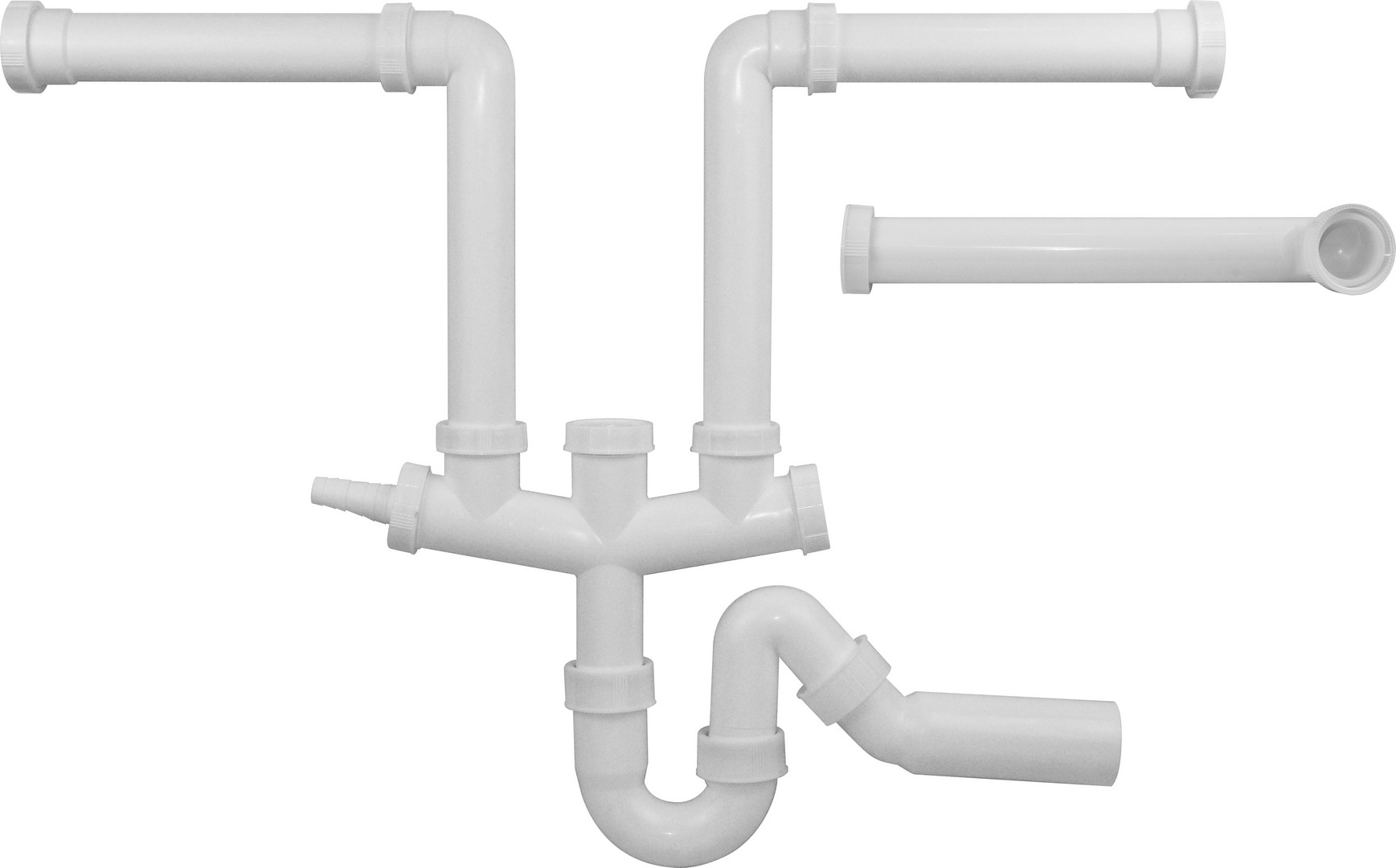 Beckenverbindung mit Geruchsverschluss-Abgang DN 50 (50 mm) und DN 40 (40 mm) für den Einbau von 2 bzw. 3 Becken mit 31/2" Korbventilen oder 1 bzw. 2 Becken mit 31/2" Korbventilen und einem Tropf mit 1 1/2" Ventil