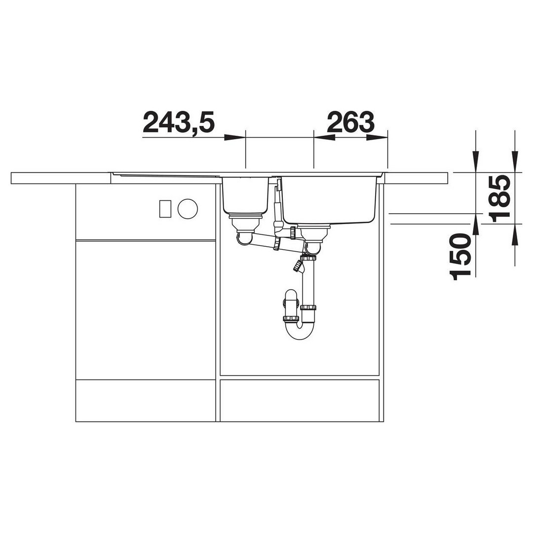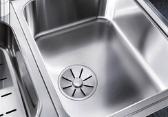 Beckentiefe 18,5/15 cm, geräumiges Hauptbecken, auch für einhängbare Funktionsschale, Zusatzbecken in zentraler Lage, Ablaufsystem InFino, mit Edelstahlschale, Ablaufgarnitur mit platzsparendem Rohr, 2x 3 1/2‘‘ Ablauffernbedienung (Drehbetätigung) für das Hauptbecken, reversibel einbaubar, IF-Flachrand, Untermaß 60 cm