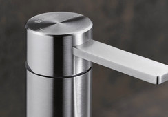 Edelstahl massiv, angesetzter Auslauf, 13,2 l/ min bei 3 bar Druck, Auslauf 360° schwenkbar, Armaturenbohrung Ø 35 mm erforderlich, mit Keramik-Scheibenkartusche, patentierter Strahlregler, flexible Anschlussrohre mit 700 mm Länge und 3/8" Mutter, Stabilisierungsplatte