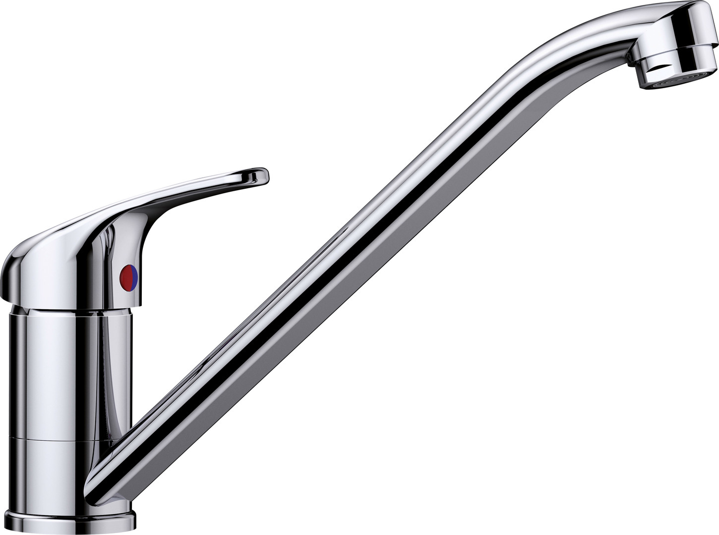 langer Auslauf, Einsteigermodell, für kleine Spülen geeignet, 15,4 l/min (Hochdruck) / 6,2 l/min (Niederdruck) bei 3 bar Druck, hoher Auslauf 360° schwenkbar, Armaturenbohrung Ø 35 mm erforderlich, mit Keramik-Scheibenkartusche, patentierter Strahlregler, flexible Anschlussrohre mit 500 mm Länge und 3/8" Mutter, Stabilisierungsplatte