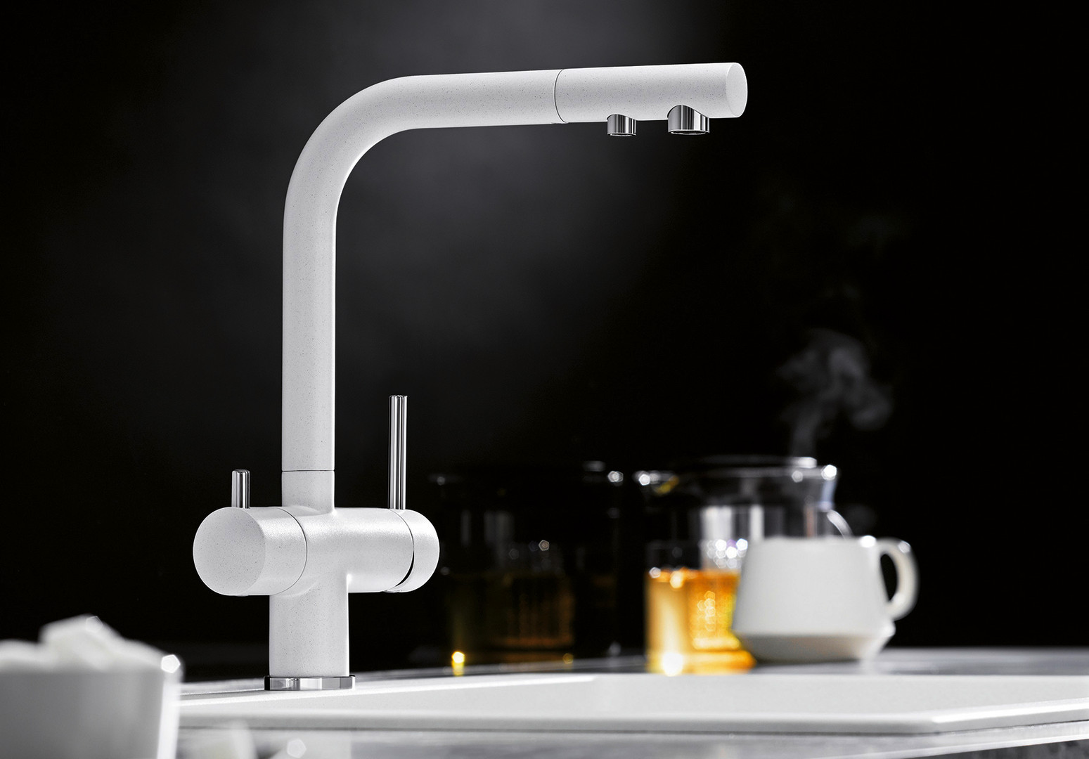 Mischhebel rechts für Kalt- und Warmwasser sowie Drehgriff links für gefiltertes Wasser, getrennte Wasserführung und separater Auslass für gefiltertes Wasser, Auslauf 360° schwenkbar, Hahnlochbohrung mit Ø 35 mm erforderlich, Keramikventil und Scheibenkartusche, Klarstrahlbelüfter, flexible Anschlussrohre mit 500 mm Länge und 3/8'' Mutter, Stabilisierungsplatte, Filtersystem nicht im Lieferumfang enthalten