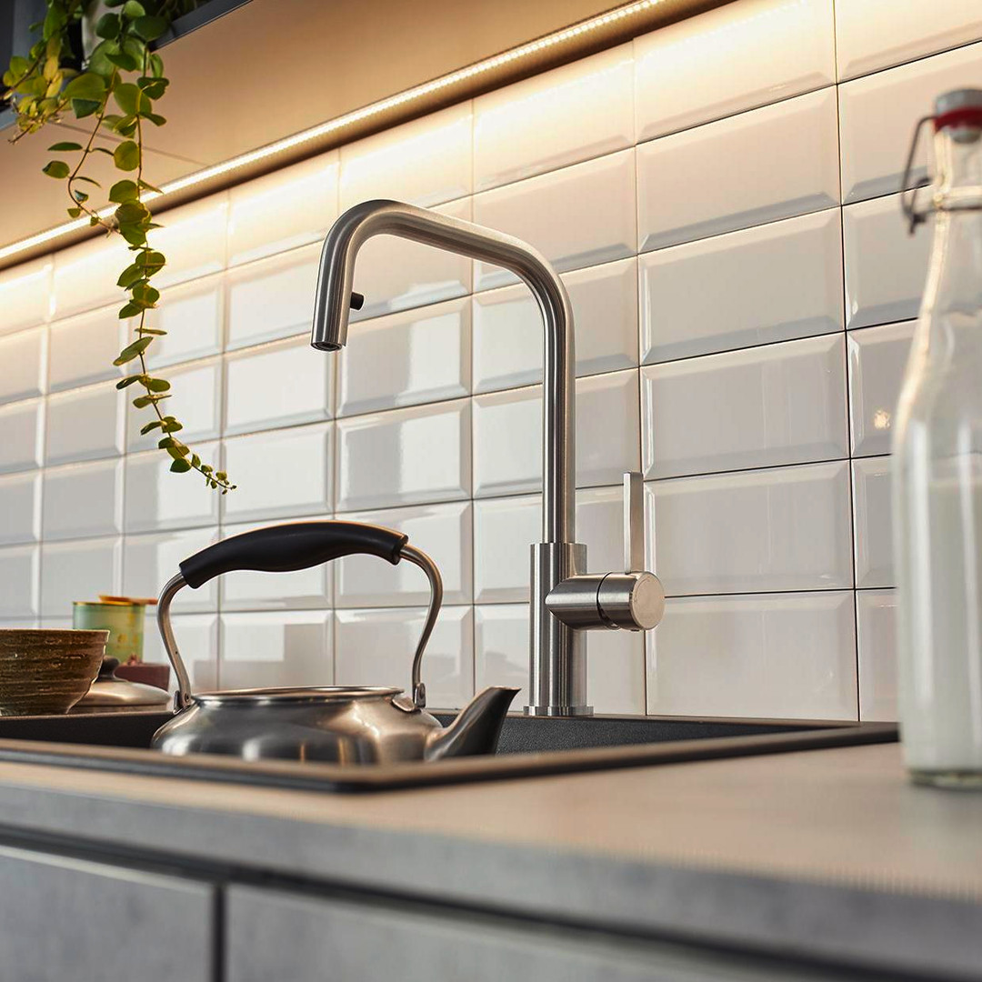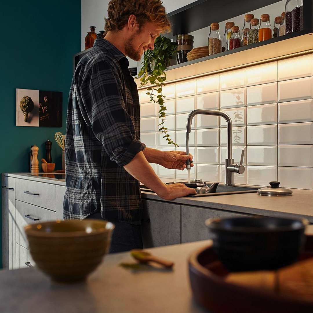 Edelstahl massiv, Bedienhebel mit senkrechter Nullstellung, energiesparend (Grundeinstellung des Bedienhebels auf Kaltstart, 9,9 l/ min bei 3 bar Druck, hoher Auslauf 190° schwenkbar, Armaturenbohrung Ø 35 mm erforderlich, mit Keramik-Scheibenkartusche, patentierter Strahlregler, Brause aus Kunststoff, versteckter Sprühstrahl mit rückwärtigem Führungsstift, Nylonummantelter Brauseschlauch, Schlauchgewicht für sicheren Rückzug, flexible Anschlussrohre mit 700 mm Länge und 3/8" Mutter, Stabilisierungsplatte, mit Rückschlagventil nach EN 1717