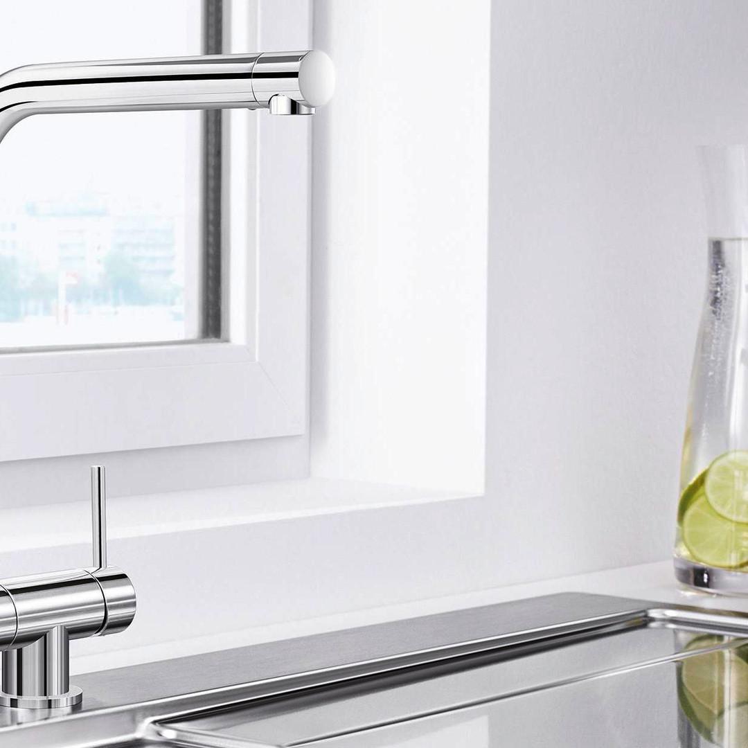 zur Installation vor einem Fenster, Klapp-Mechanismus zum seitlichen Umlegen der Armatur, gedämpfter Klapp-Vorgang und sicheres Einrasten, Bauhöhe ermöglicht komplettes Versenken des Auslaufs in das Becken, Mindestabstand zwischen Spüle und Fensterflügel 6,5 cm, 11,83 l/min bei 3 bar Druck, hoher Auslauf 360° schwenkbar, Armaturenbohrung mit Ø 35 mm erforderlich, Keramik-Scheibenkartusche, patentierter Strahlregler, flexible Anschlussrohre mit 500 mm Länge und 3/8" Mutter, Stabilisierungsplatte