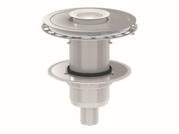 Ablaufstutzen DN 50 senkrecht, Montage- und Verstärkungsblech aus Edelstahl 1.4404, TistoDrain Aufstockelement N mit Vlies-kaschiertem Flansch, herausnehmbarer Geruchs- und Reinigungsverschluss, Sperrwasserhöhe 50 mm (gem. DIN EN 1253), Gleitdichtung für Klebebettdicke 0-20 mm, Rückstaudichtung, Bauschutzdeckel/Montageschlüssel, Polypropylen, hochschlagfest