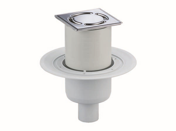 Ablaufleistungen nach DIN EN 1253 TAB. 3, (20 mm Anstauhöhe), in Verbindung mit DIN EN 274, geruchsicher auch ohne Wasser, Ablaufstutzen DN 50 senkrecht, 50 mm Glockengeruchsverschluss mit Sperrwasser und mechanisch wirkender Sperre, höhenverstellbarem Aufsatz E 12, Bauschutzdeckel, Polypropylen, hochschlagfest, Rahmen/Rost aus Edelstahl 1.4301, Belastungsklasse K 3 (300 kg), kann mit Brand- und Schallschutz Rohbauelement 2 (Art. Nr. 515025) verwendet werden