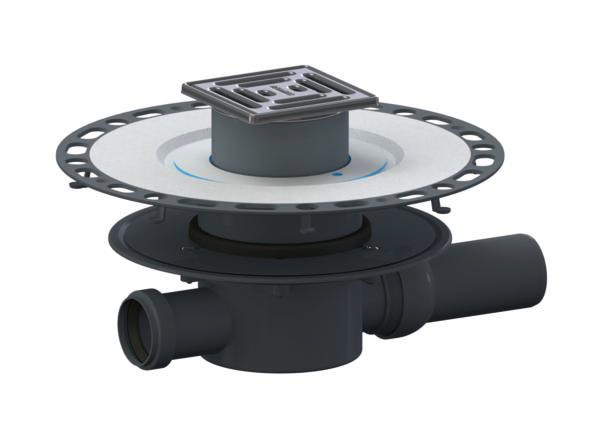 Komplettablauf bestehend aus Bodenablaufgehäuse 42 S, TistoDrain Aufstockelement S 10 und einem stufenlos bis zu 40 mm höhen- und bis zu +/-5,5 mm seitenverstellbaren Aufsatz