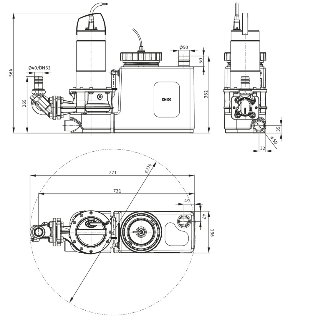 DrainLift SANI CUT-S.27/T540/1-CEE, DN 90 (90 mm)/DN 110 (110 mm) (PN 0,5/PN 0,5), DN 32/DN 40/Ø40mm (PN 6/PN 6/PN 6), 1100 W, 1560 W