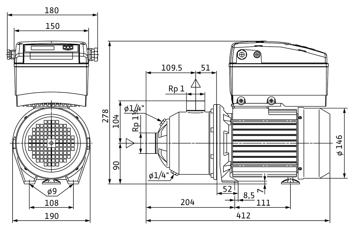Economy MHIE403-1 (1~220/230/240 V, EPDM), Rp 1¼ (PN 10), Rp 1 (PN 10), 1100 W