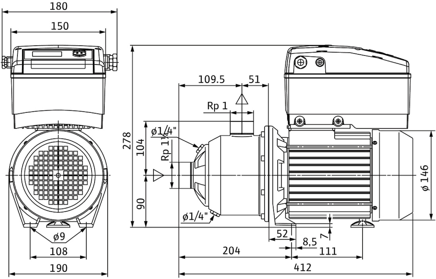 Economy MHIE403-2 (1~220/230/240 V, EPDM), Rp 1¼ (PN 10), Rp 1 (PN 10), 1100 W