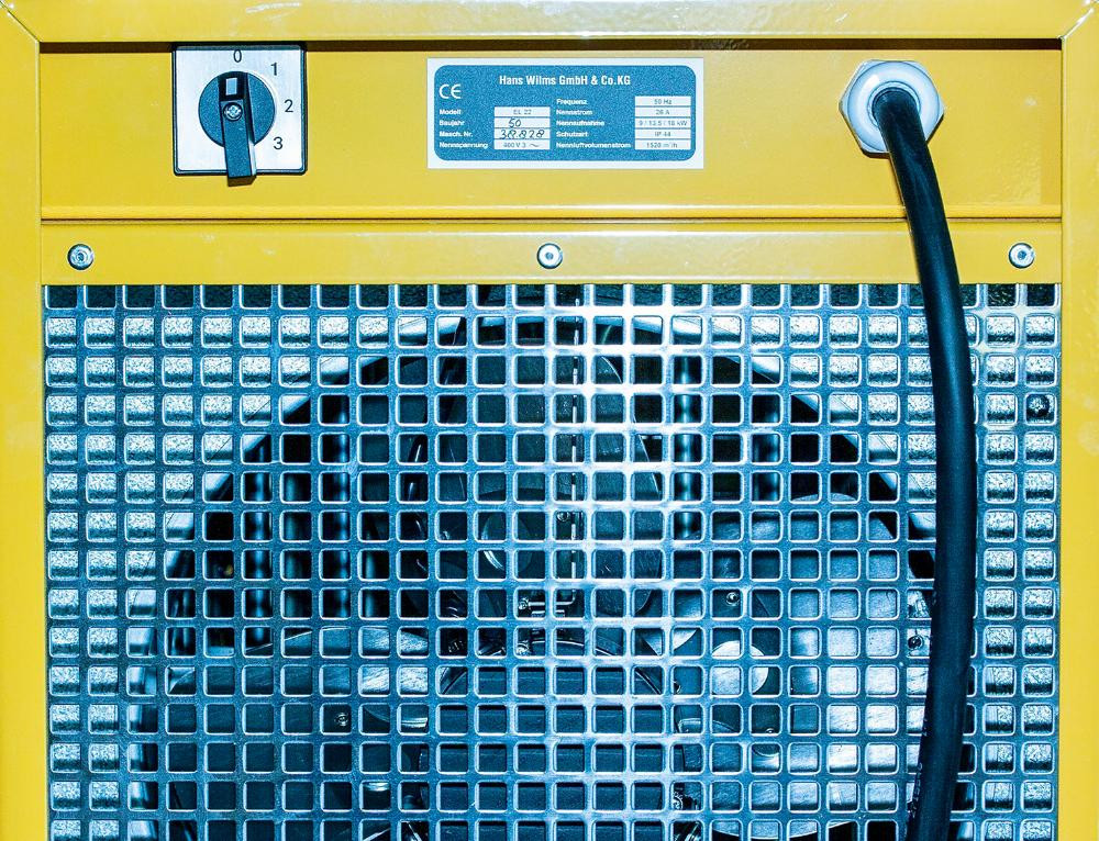 Dieses elektrische Heizgerät dient zum Trocknen, Auftauen, Erhitzen oder einfach zur Belüftung auf Baustellen, Gebäuden, Kellern.