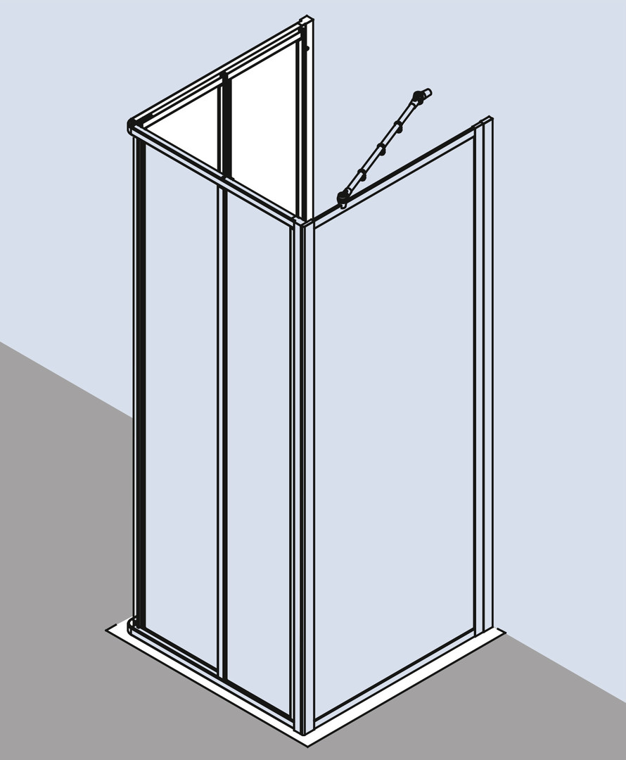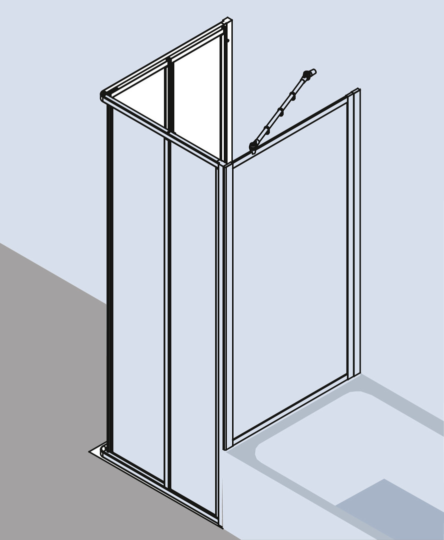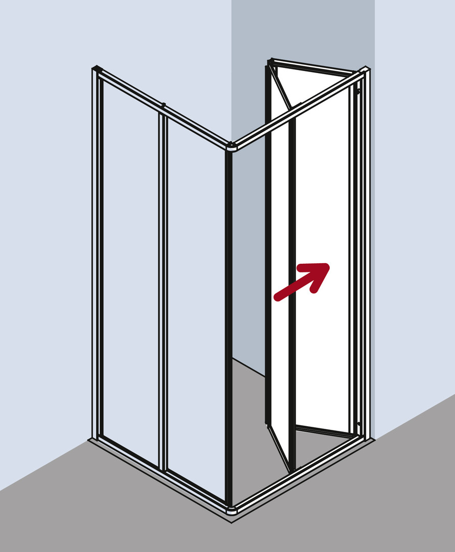 Glasstärke 3 mm, nur kombinierbar mit Eckeinstieg 2-teilig Gleittür (FU0605001.…), nach einer Seite nach innen öffnend, Profile und Griffleisten aus eloxiertem Aluminium, Verstellmöglichkeit im Wandprofil 22 mm, durchgehende Magnetleisten und Dichtprofile, mit Befestigungsmaterial und 1 Aufhänge-Knopf, mit Bodenprofil (Höhe 32 mm)