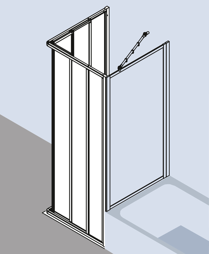 Glasstärke 3 mm, nach einer Seite öffnend, mit Festfeld, Profile und Griffleisten aus eloxiertem Aluminium, Verstellmöglichkeit im Wandprofil 22 mm, durchgehende Magnetleisten und Dichtprofile, mit Befestigungsmaterial und Bodenprofil (Höhe 32 mm)