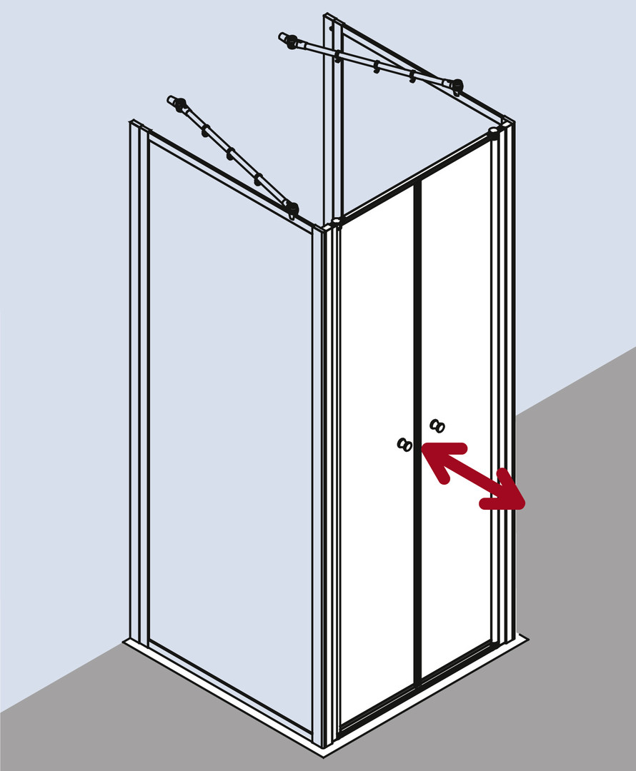 Glasstärke 4 mm, mit 2 Türflügeln, nach innen und außen öffnend, mit Zugstab, Profile aus eloxiertem Aluminium, Griffe aus Kunststoff, Verstellmöglichkeit je Wandprofil 17,5 mm, Türprofile mit Hebe-Senk-Mechanismus, durchgehende Magnetleisten und Dichtprofile, mit Bodenschwelle (Höhe 16 mm), mit Befestigungsmaterial
