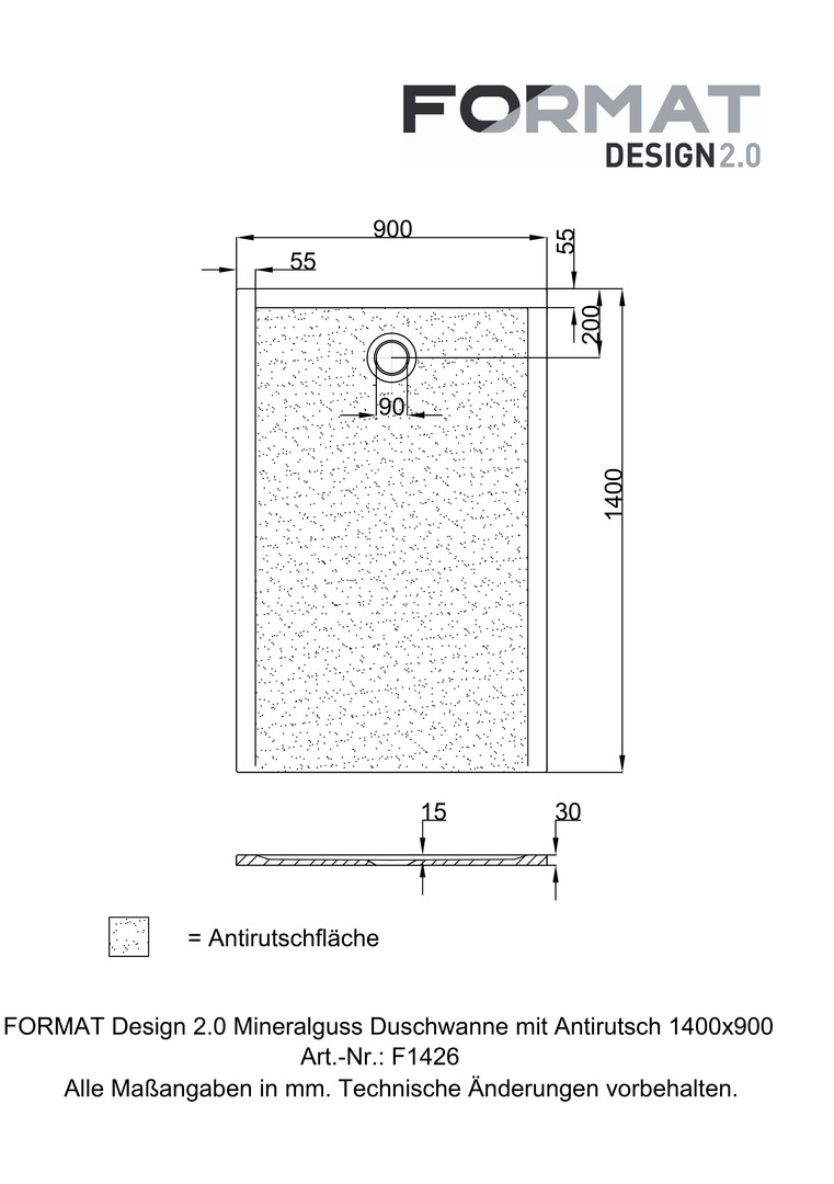 FORMAT Design 2.0 Duschwanne Mineralguss 140 x 90 x 3 cm, weiß, Ablauf kurze Seite, mit Antirutsch
