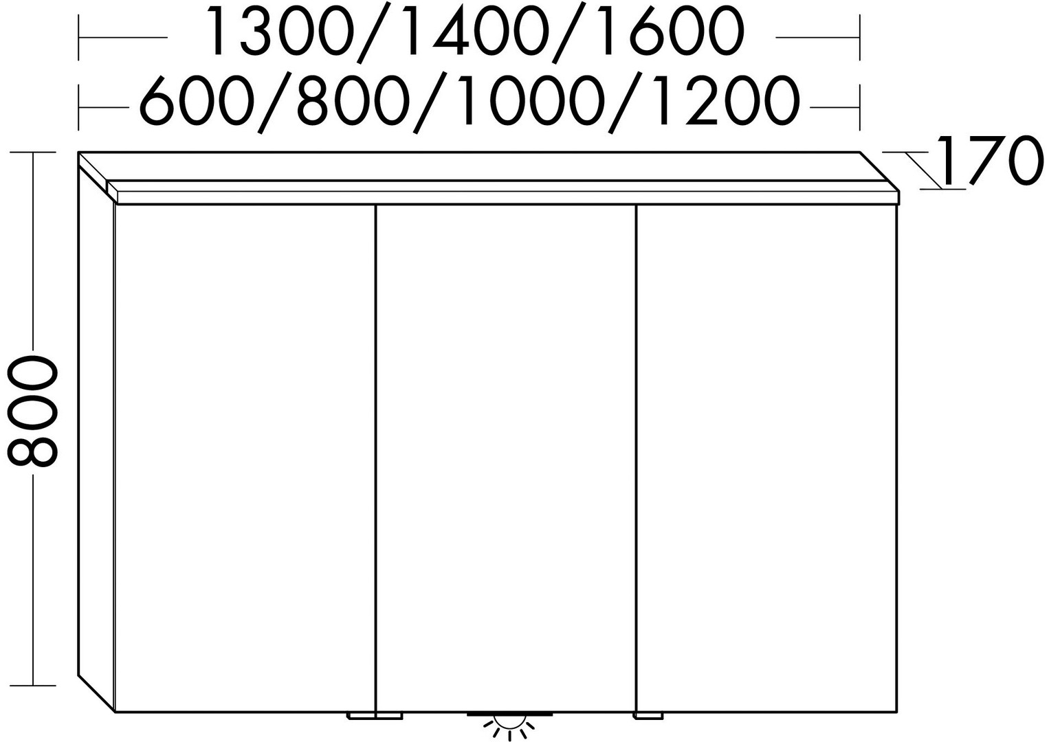 horizontale LED-Aufsatzleuchte mit Lichttemperatursteuerung: Kalt/Warmweiß, LED-Waschtischbeleuchtung 5W, Spiegeltüren beidseitig verspiegelt, 3000-6500 K, Glaseinlegeböden, Schalter-/Steckdosenelement, IP24, Tiefe 170 mm
