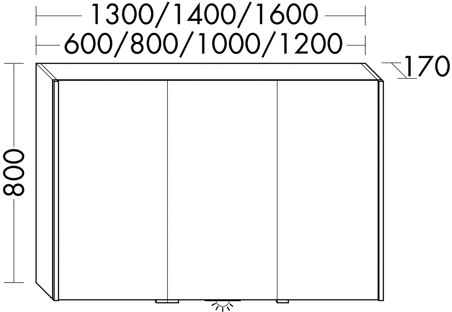 vertikale LED-Beleuchtung mit Lichttemperatursteuerung: Kalt/Weiß, LED-Waschtischbeleuchtung 5 W, Spiegeltüren beidseitig verspiegelt, 3000-6500 K, Glaseinlegeböden, Schalter-/ Steckdosenelement, IP24, Tiefe 170 mm