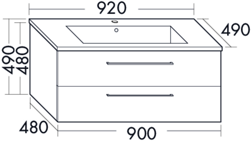 Waschtisch Muldentiefe: 120 mm, Beckenmaß 620x330 mm, WTU 1 Schublade oben mit Siphonausschnitt, 1 Auszug unten mit Innenteilung, mit Raumsparsiphon