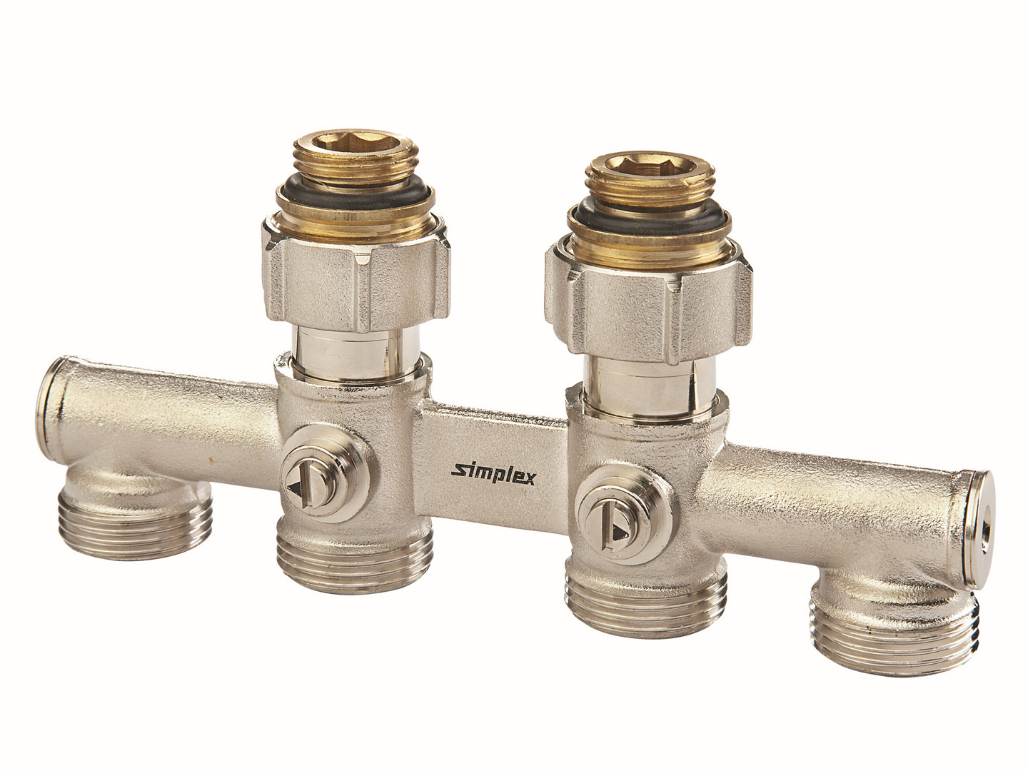 für Ventil-Kompaktheizkörper, mit 3-Wege-Kugelabsperrung zur verzweigungslosen Verlegung im Fußboden oder zum Anschluss weiterer Heizflächen, mit Stellungsanzeige, ohne Anschlag, rohrseitig mit Eurokonus für den Anschluss mit Klemmverschraubungen, 50 mm Achsabstand, mit Anschlussnippeln mit O-Ringabdichtung für Ventil-Kompaktheizkörper mit Rp 1/2 Hahnblock-Anschluss, Dichtmaterialien: EPDM, PTFE, max. Betriebstemperatur: 110 °C Dauertemperatur/130 °C kurzzeitig, max. Betriebsdruck 10 bar