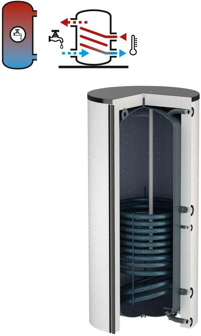 indirekt beheizter Standspeicher mit fest eingeschweißtem Glattrohrwärmetauscher, seitlicher Besichtigungsflansch (DN 205) zum Anschluss zusätzlicher Wärmequellen (Elektroheizung usw.) verwendbar, Fußhöhenverstellung zur Ausrichtung, kombinierbar mit allen modernen Heizungsanlagen, ausgerüstet mit Thermometer und Fühlerklemmleiste, zulässiger Betriebsüberdruck: Rohrschlange/Speicher 16 bar/10 bar, zulässige Betriebstemperatur: Rohrschlange/Speicher 110 °C/95 °C, Emaillierung nach DIN 4753/3 mit Mg-Anode, Standardfarbe weiß (RAL 9010), EPS-Isolierung (Brandklasse B1) mit Polypropylendeckschicht (Brandklasse B2)