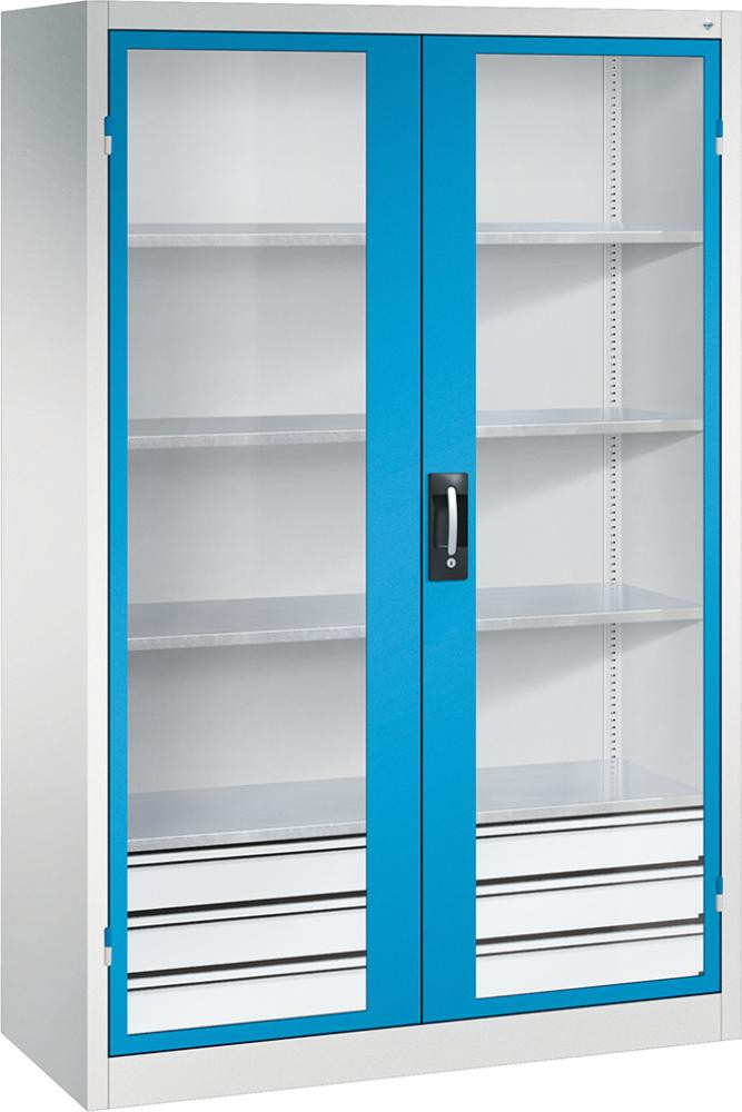 Schwerlastschrank, mit Sichtfenster-Flügeltüren und Schubladenblock unten
