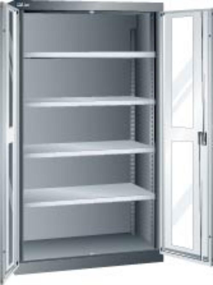 Flügeltürenschrank B1100xT641xH1950mm RAL 5012,Sichtfenstertür 4 Böden