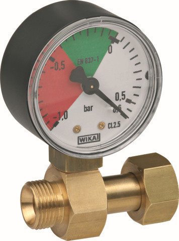 zum Einbau zwischen Filter und Brennerschlauch, Anzeigebereich -1,0 bis 0,6 bar, Genauigkeitsklasse 2,5, Druckbereich rot -1,0 bis -0,4 bar/grün -0,4 bis 0 bar, für Saugleitungen zur Prüfung des Unterdruckes bzw. zur Funktionsprüfung einer Sicherheitseinrichtung gegen Aushebern durch Messung des Unterdruckes unmittelbar am Einbauort, Ausführung mit Manometer-Schutzventil gegen mögliche Druckerhöhung in der Saugleitung in Folge tempeaturbedingter Volumenänderung des Heizöls für Druckfestigkeit PS 10 bar, Druckmessgerät nach EN 837-1 (Ø 50 mm)