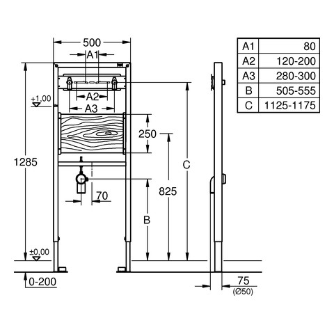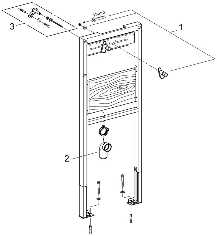 für Vorwand- oder Ständerwandmontage, Stahlrahmen komplett vormontiert, mit Schnellverstellung und Höhensicherung, Befestigungsmaterial, wasserfeste Schichtholzplatte, HT-Ablaufbogen Ø 5 cm, 2 schallgedämmte Armaturenanschlüsse 1/2", Wandwinkel 38 558 00M für Vorwandmontage müssen separat bestellt werden