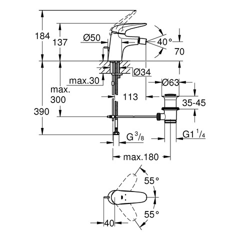 GROHE Bidet-Einhebelmischer Eurostyle 1/2", mit Zugstangen-Ablaufgarnitur, geschlossener Metall-Hebelgriff, chrom