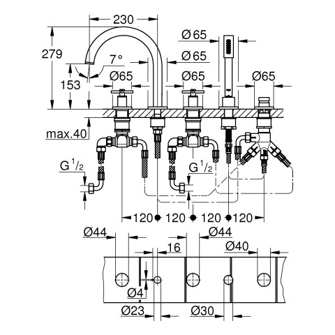 GROHE Fertigmontageset Atrio 5-Loch-Wannen-Kombination, mit Kreuzgriffen, chrom K20547156
