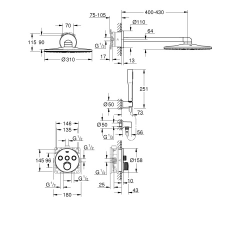 GROHE Fertigmontageset SmartControl UP-Duschsystem, mit 3 Absperrventilen, rund, chrom