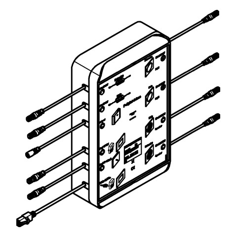 Steuerung der Licht- und Musikmodule, bestehend aus 2 Steckverbindungen für zwei Musikmodule (36 473 000), 2 Steckverbindungen für ein Paar Lichtmodule (36 472), 2 Steckverbindungen für Dampfmodul (29 414 000), mit 1 Steckverbindung für Dampfgenerator und 1 Steckverbindung für Temperaturfühler, 2 Steckverbindungen für Netzteile (pro Netzteil max. vier Verbraucher), 2 Steckverbindungen für die Bluetooth-Empfangseinheit, optionales Sonderzubehör 36 474 000 zum Einbau der Steuereinheit