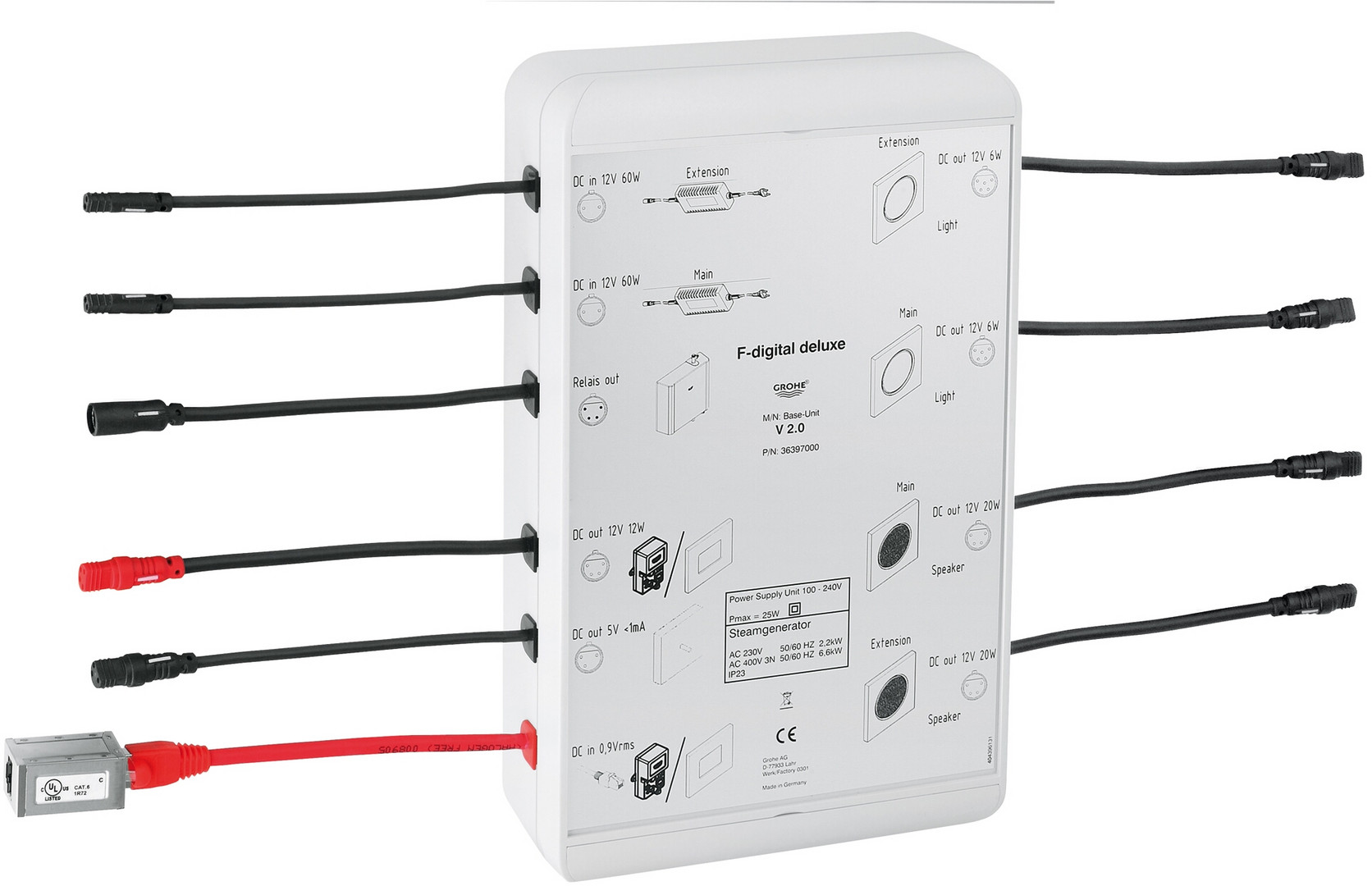 Steuerung der Licht- und Musikmodule bestehend aus 2x Steckverbindungen für zwei Musikmodule (36 360 000), 2x Steckverbindungen für zwei Lichtmodule (36 359 000) oder Deckenbrause (27 865 000) mit integrierten Lichtmodulen, 2x Steckverbindungen für Netzteile (pro Netzteil max. 4 Verbraucher), 2x Steckverbindungen für Bluetooth-Empfangseinheit, CE-Zeichen, optionales Sonderzubehör 36 367 00 zum Einbau der Steuereinheit