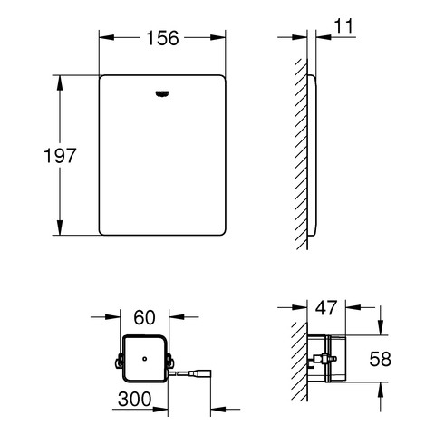 für Wandeinbau-Spülkästen 6-9 l, zum Anschluss eines oder mehrerer potenzialfreier Taster, geeignet für Stützklappgriffe mit integrierten Taster von Hewi, Keuco, Lehnen, Normbau, Pressalit, AMS, Deubad, Erlau, FRELU, FSB, Edelstahl-Abdeckplatte 15,6 x 19,7 cm, Transformator für externe Montage, Anschlussspannung 230 V AC, 50/60 Hz, 4,0 VA, Servomotor, 3 m Anschlusskabel, für die Verbindung zwischen Transformator und Elektronik, steckerfertige Anschlussleitung 3 m lang, ohne Taster/Stützklappgriff