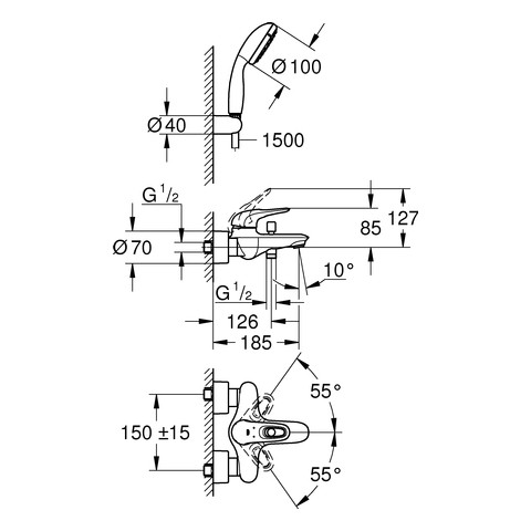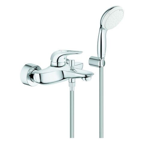 GROHE Wannen-Einhebelmischer Eurostyle 1/2", mit Brausegarnitur, offener Metall-Hebelgriff, Wandmontage, chrom