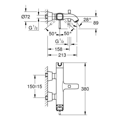 Wandmontage, SilkMove 46 mm Keramikkartusche, Long-Life Oberfläche, variabel einstellbare Mengenbegrenzung, integrierter Handbrausehalter, automatische Umstellung Wanne/Brause, Auslauf mit Mousseur, integrierter Rückflussverhinderer im Brauseabgang 1/2", verdeckte S-Anschlüssee, eigensicher gegen Rückfließen