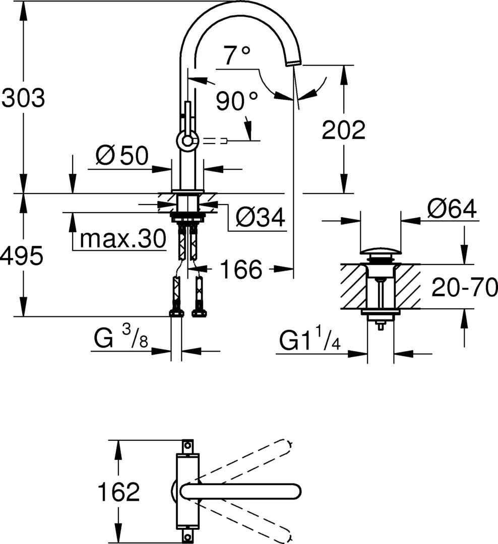GROHE Waschtisch-Zweigriff-Armatur Atrio 1/2", L-Size, mit Hebelgriffen, Push-Open Ablaufgarnitur 1 1/4", supersteel K20547234