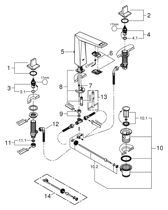 Keramik-Oberteile 1/2", 90°, StarLight Oberfläche, EcoJoy 5,0 l/min Durchflusskonstanthalter, Auslauf mit integriertem Mousseur, Zugstangen-Ablaufgarnitur 1 1/4", druckfeste, flexible Verbindungsschläuche zwischen Mittelkörper und Seitenventilen