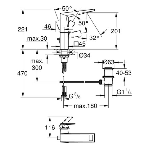 | Aufbauhöhe Unterkante Hahnauslass | 201 mm |