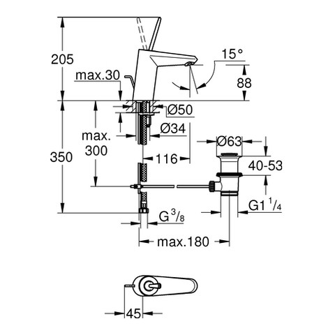 Einlochmontage, FeatherControl Joystick Kartusche, Long-Life Oberfläche, Water Saving weniger Wasser, max. Durchfluss bei 3 bar 5 l/min, SpeedClean Mousseur, FastFixation Plus Schnellbefestigungssystem, Zugstangen-Ablaufgarnitur 1 1/4", flexible Anschlussschläuche