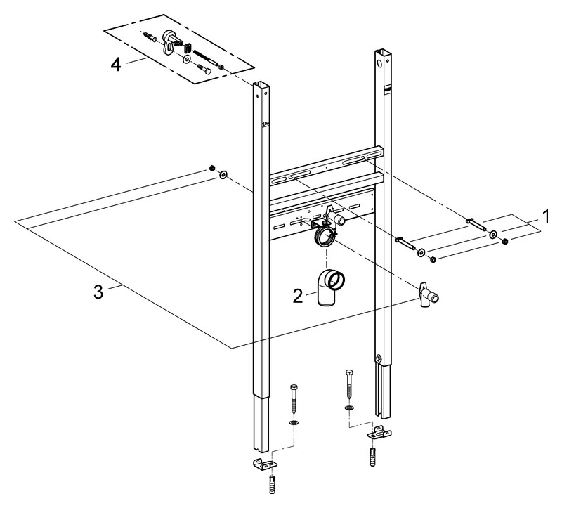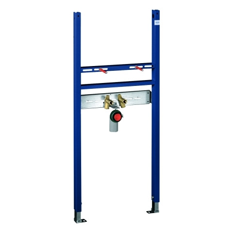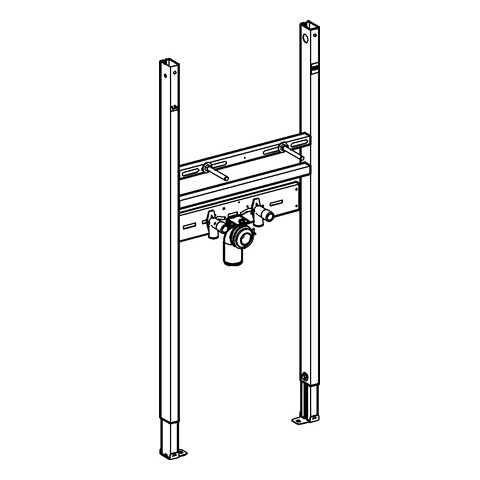 für Vorwand- oder Ständerwandmontage, Stahlrahmen, Befestigungsmaterial, Waschtisch-Haltebolzen M 10, mit Keramikbefestigung, Schraubenabstand variabel, HT-Ablaufbogen Ø 5 cm, Dichtung Ø 3,2 cm, 2 schallgedämmte Armaturenanschlüsse 1/2", Wandwinkel 38 558 00M für Vorwandmontage müssen separat bestellt werden