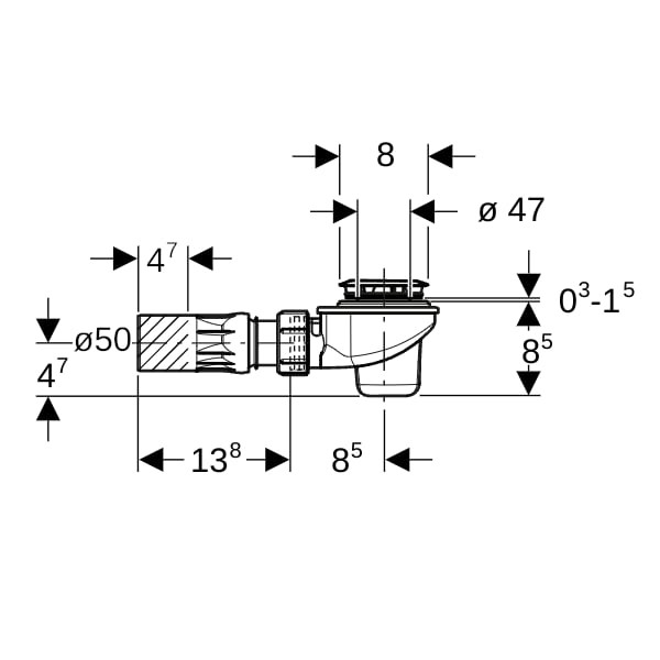 für Duschwanne, güteüberwacht nach EN 274-3, Tauchrohr und Tauchrohrträger demontierbar, bestehend aus Geruchsverschluss, Anschlussstutzen aus PE-HD, Ø 50 mm, mit Kugelgelenk und Befestigungsmaterial
